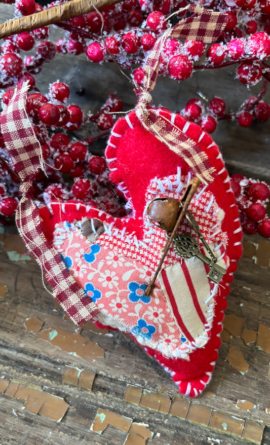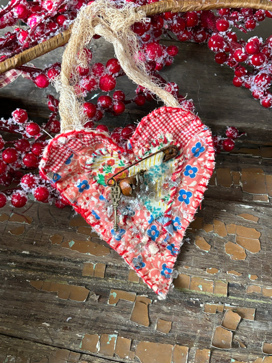 Primitive Valentines Day Heart, Antiwue Feed Sack Fabric Heart, Heart Ornie, Hanging Heart Ornament, Primitive Farmhouse, Quilted Heart