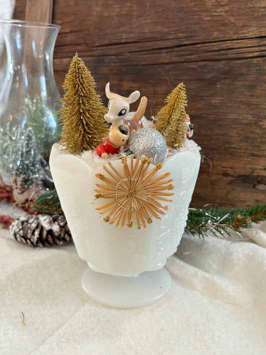 Vintage Christmas Tree Tabletop Arrangement Centerpiece in Milk Glass Vase, Christmas Vignette display, Vintage Christmas Scene Mid Century Christmas, Holiday Gift