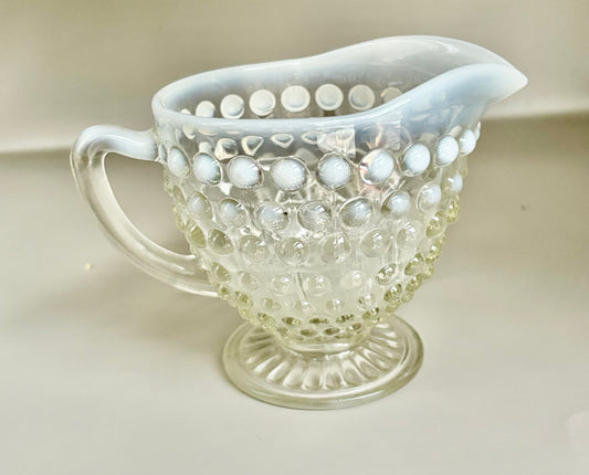 Vintage Fenton White Opalescent Moonstone Hobnail Glass Creamer Pitcher, Rare Fenton Signed