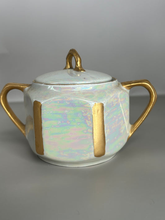 NPS Silesia | Reinhold Schlegelmilch pearlized lusterware iridescent covered handled sugar bowl, Art Deco Sugar Bowl