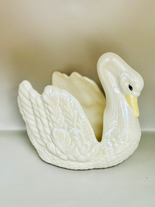 Vintage White Iridescent Swan Planter pearlescent Swan figurine, Vintage Handmade SIGNED Planter