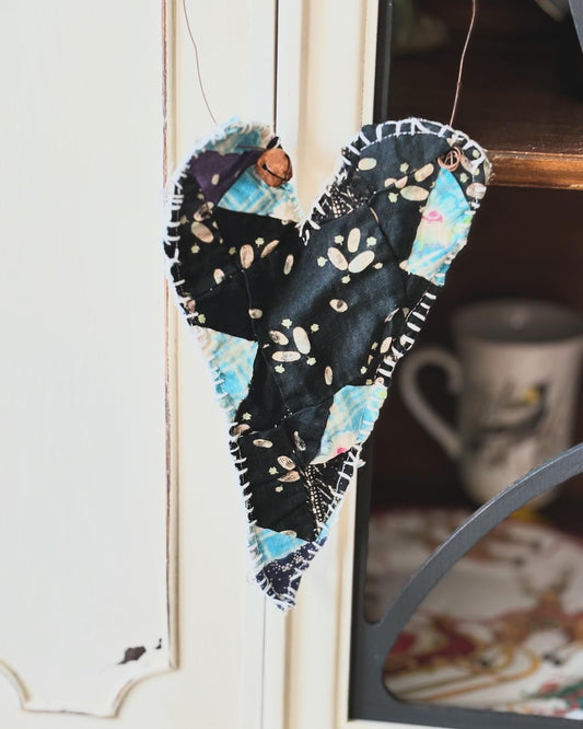 Primitive Valentines Day Heart, Antiwue Feed Sack Fabric Heart, Heart Ornie, Hanging Heart Ornament, Primitive Farmhouse, Quilted Heart