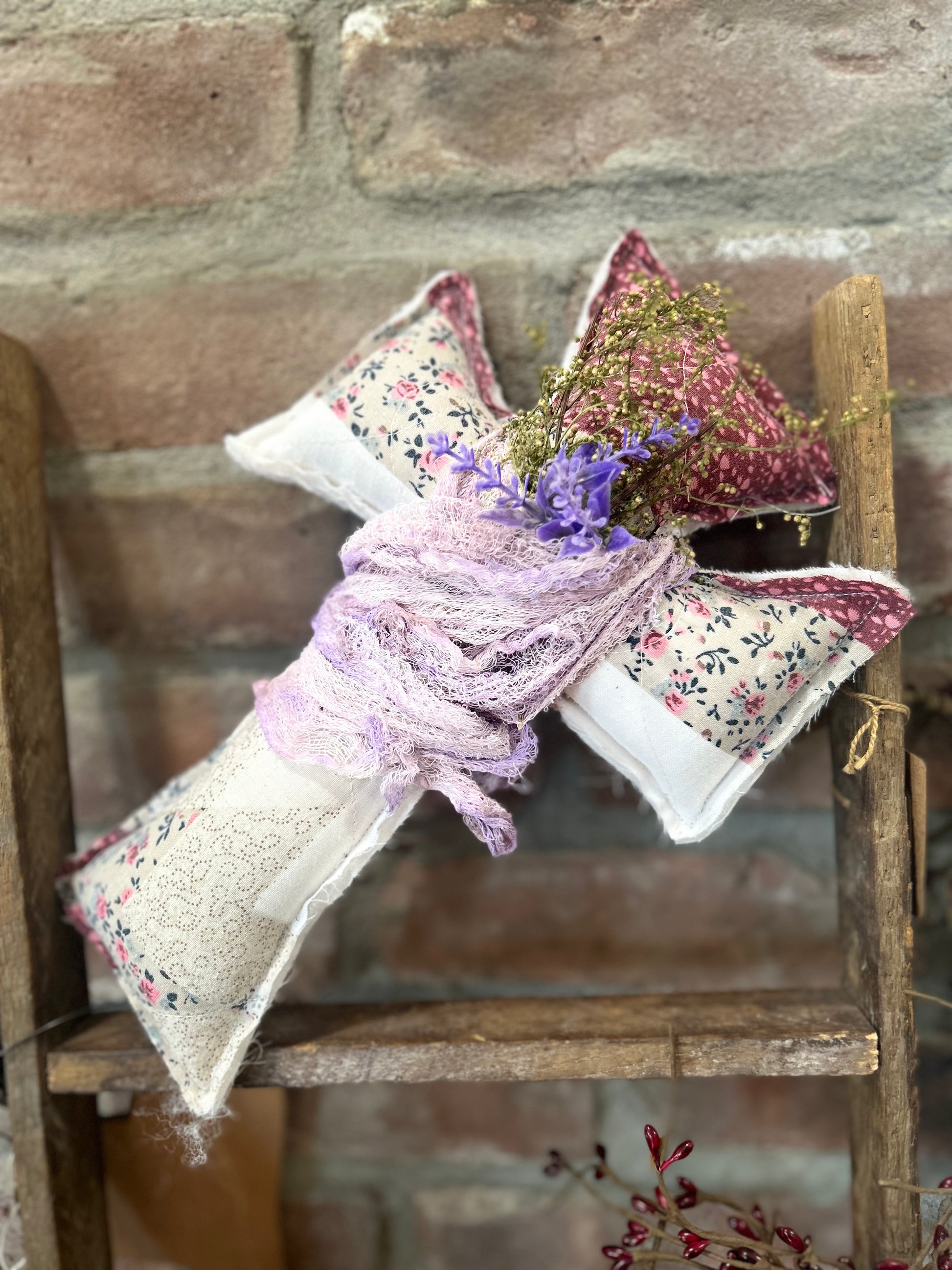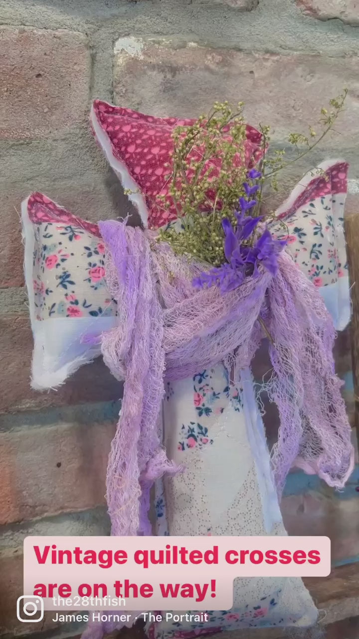 These gorgeous, large crosses are made from one of a kind vintage quilting and are hand sewn. They are decorated with a dyed purple cheesecloth shroud and sweet Annie. Each one will be unique in its own way.