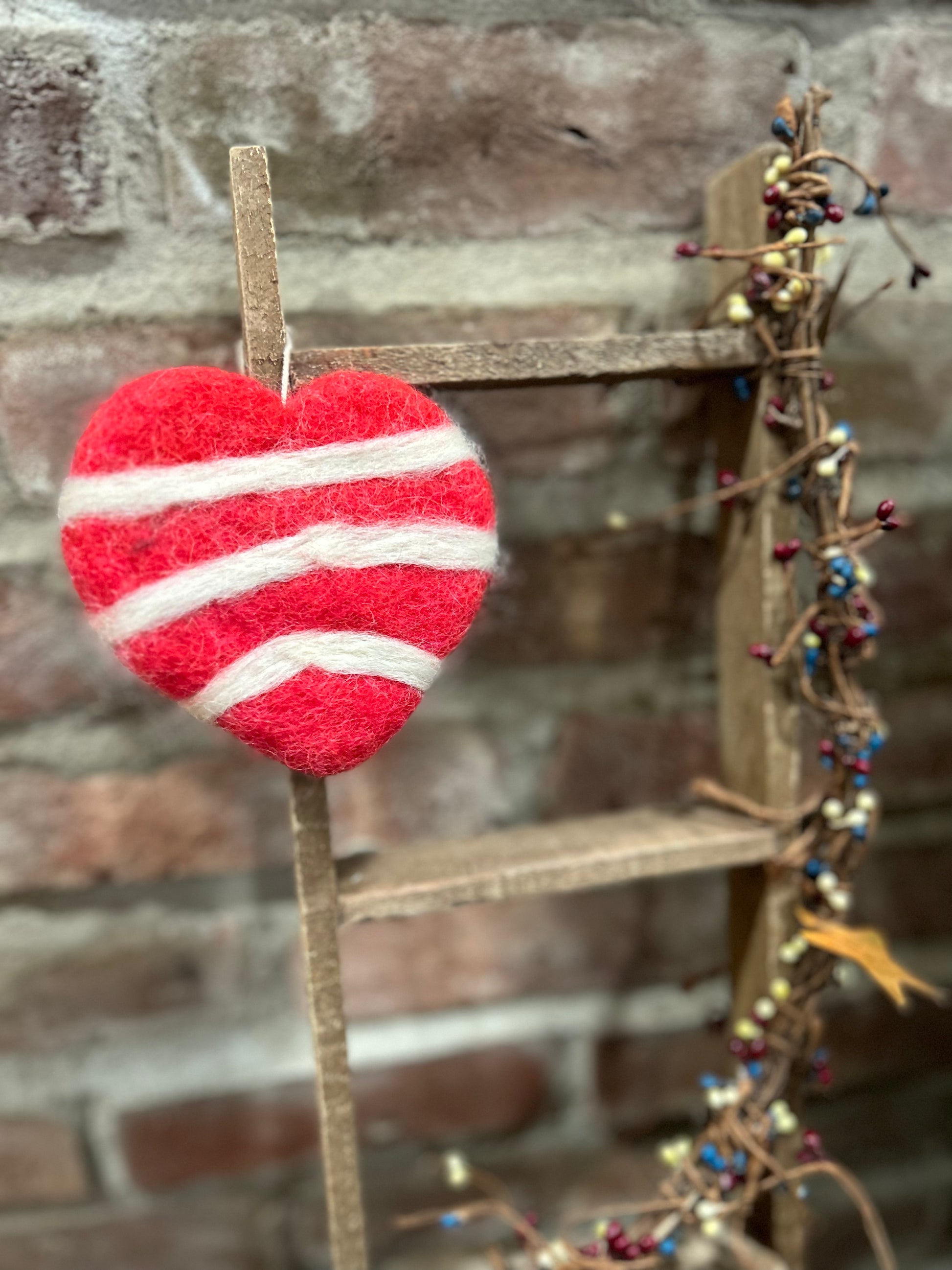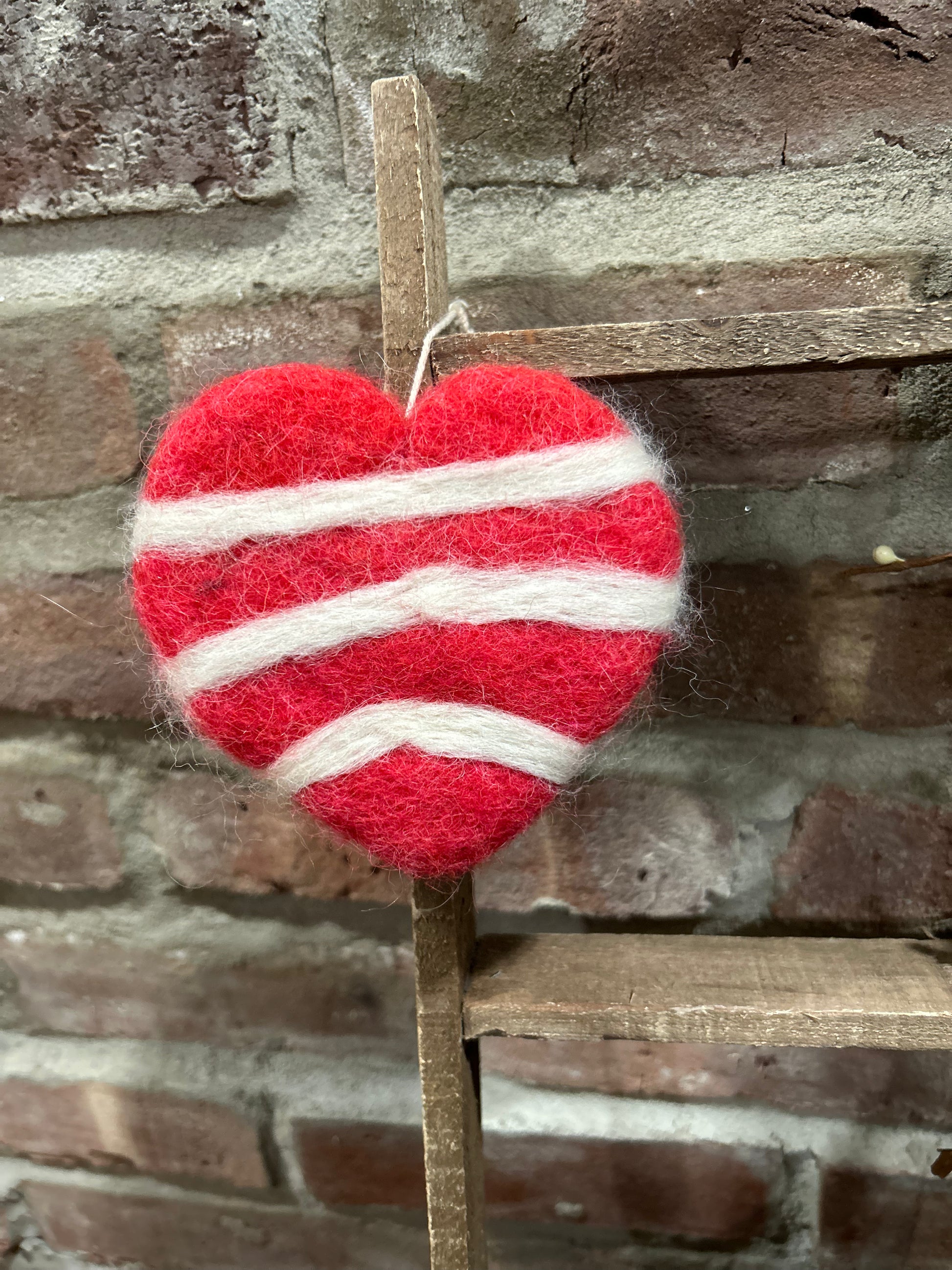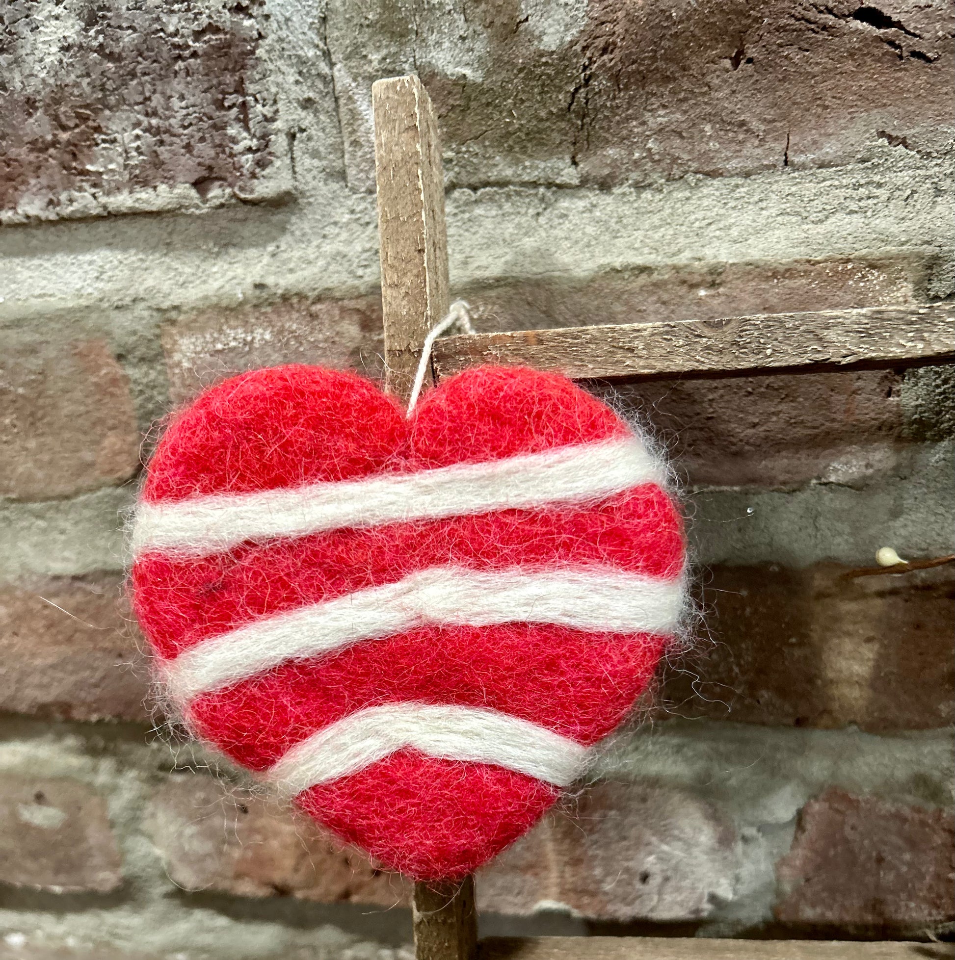 a handmade, hand felted woolen striped heart with 100% genuine wool in alternating white and red colors. Comes as a hanger and can be displayed on a special Valentine’s Day tree, a peg rail, or as a bowl filler.