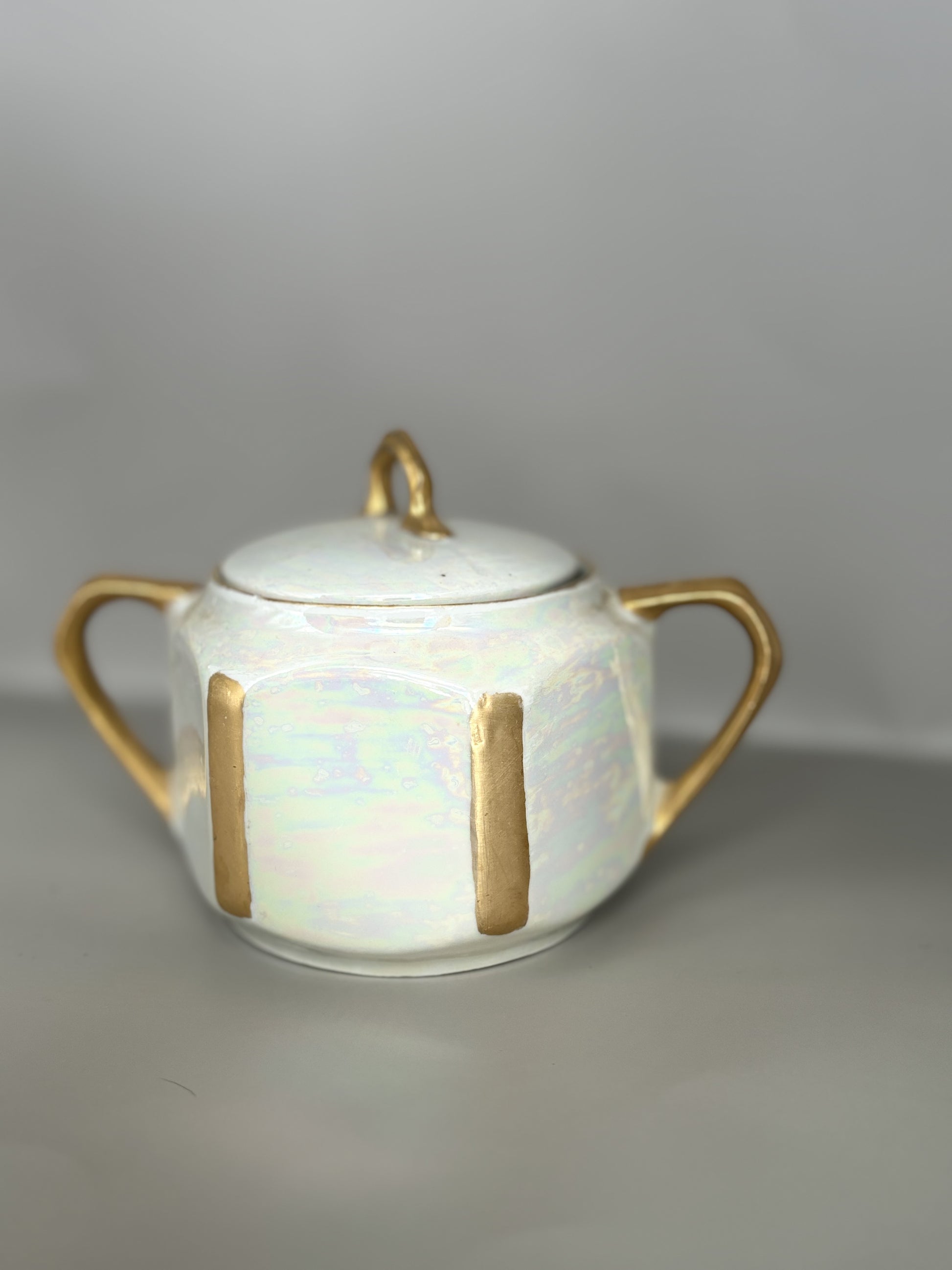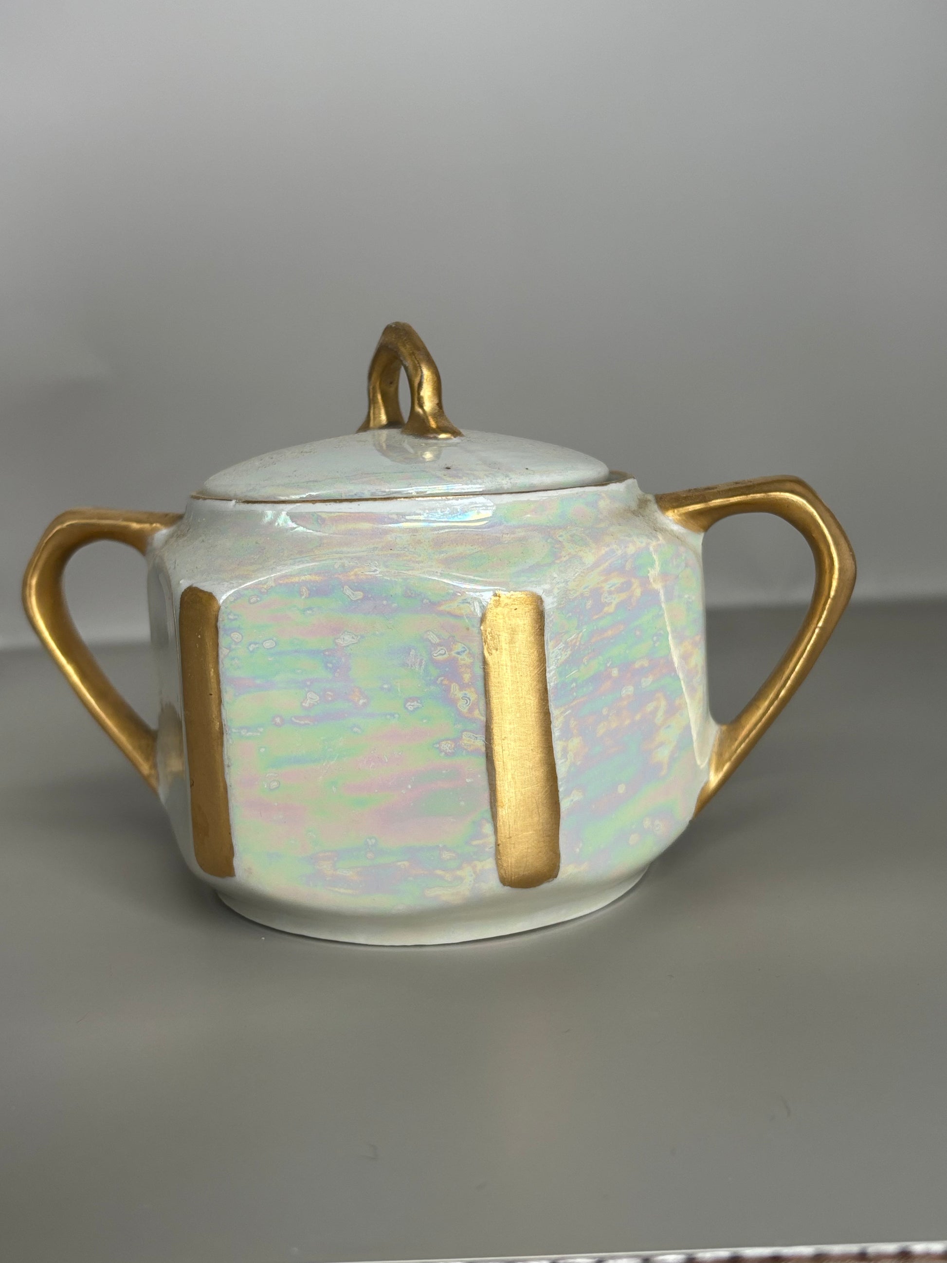 This gorgeous Art Deco covered sugar bowl has an iridescent rainbow finish that steals the show at any table. The pearlized glaze shifts from copper to green to blue depending on the light, adding a mesmerizing pop of color. Built to last with a durable chip and scratch resistant glaze. The lid keeps your sugar or sweetener fresh. The handle makes passing easy.