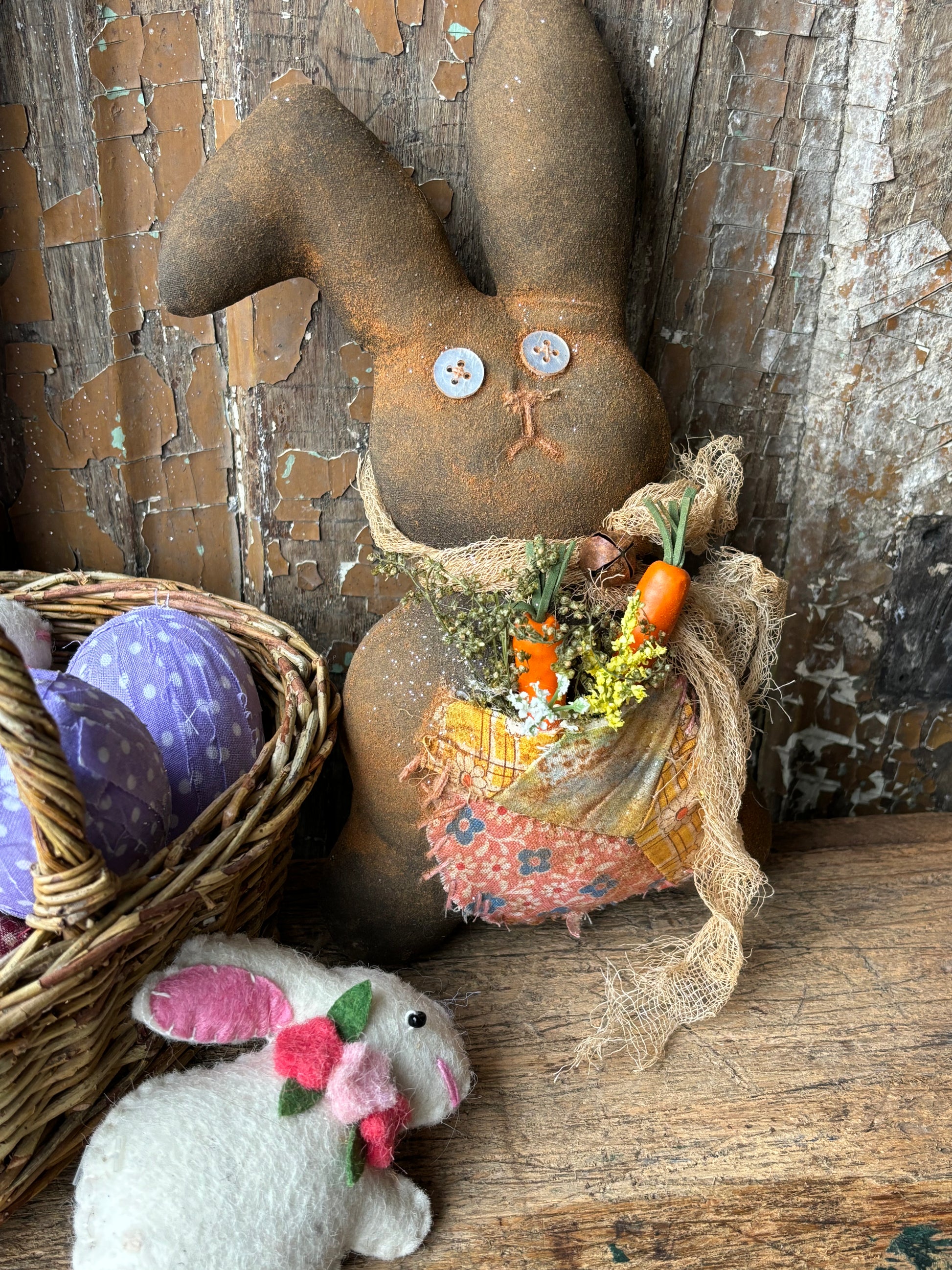 A sweet, handmade Primitive Chocolate Easter bunny featuring floppy ears, a one of a kind quilted pouch, and a stained cheesecloth scarf. he is hand sewn and painted with a deep chocolate brown. I covered his body in a special cinnamon mix for an extra prim look. His quilt pouch is from an old cutter quilt and has been generously stuffed with dried sweet Annie and miniature carrots. Due to their handmade nature, there will be some slight variations in appearance or materials.