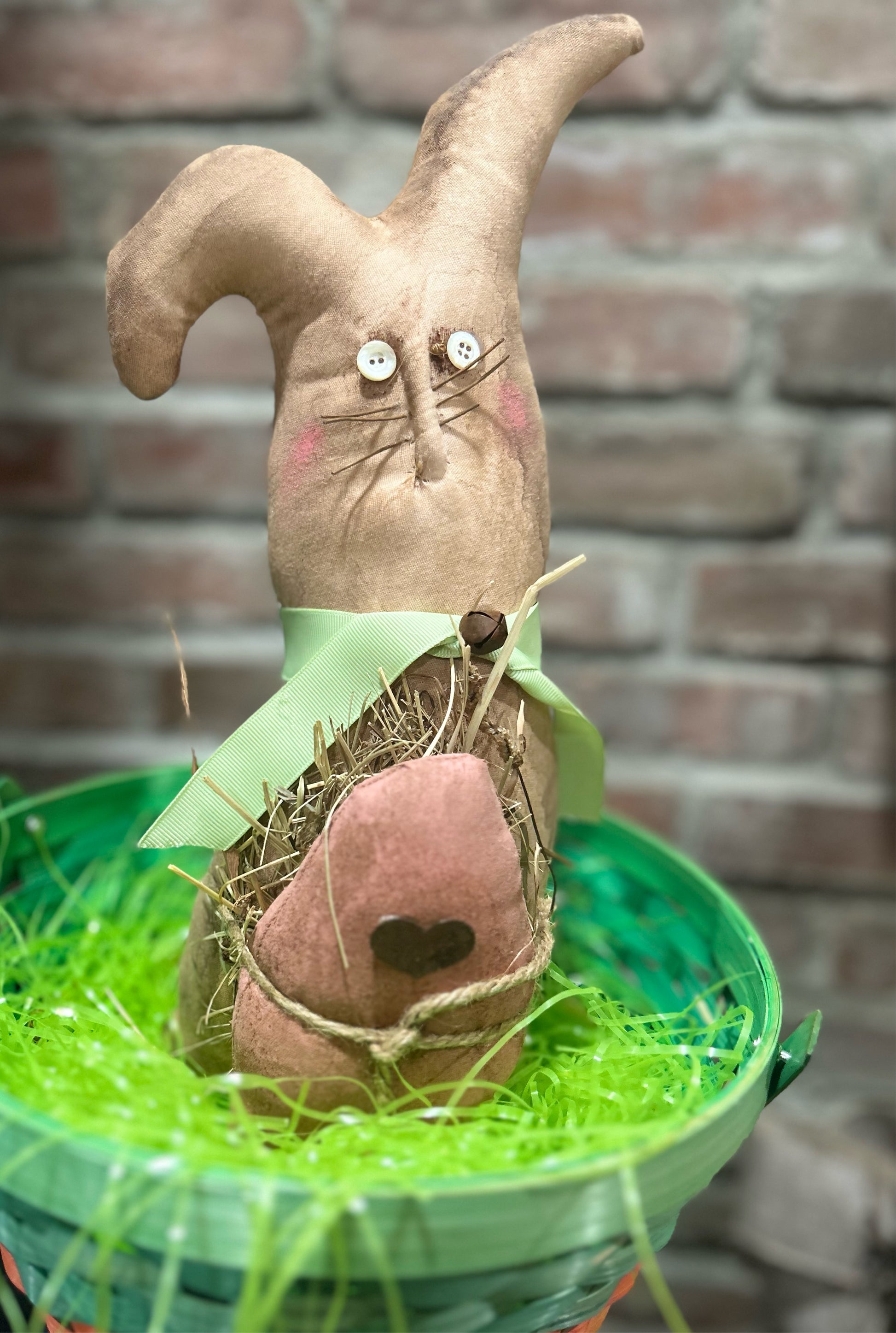 A large primitive bunny handmade, sewn, and decorated in a primitive, grungy style. He has floppy ears, and holds a pink Easter egg. He has been distressed for that aged, primitive look.
