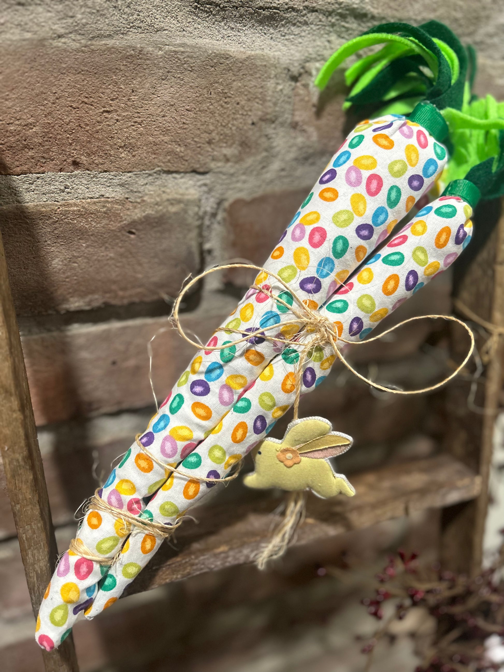 handmade bunches of carrots made from a jelly bean fabric and wool felt greenery tops. Adorable for your Easter and spring decor! Place them in your bowls, trenches, and cupboards.