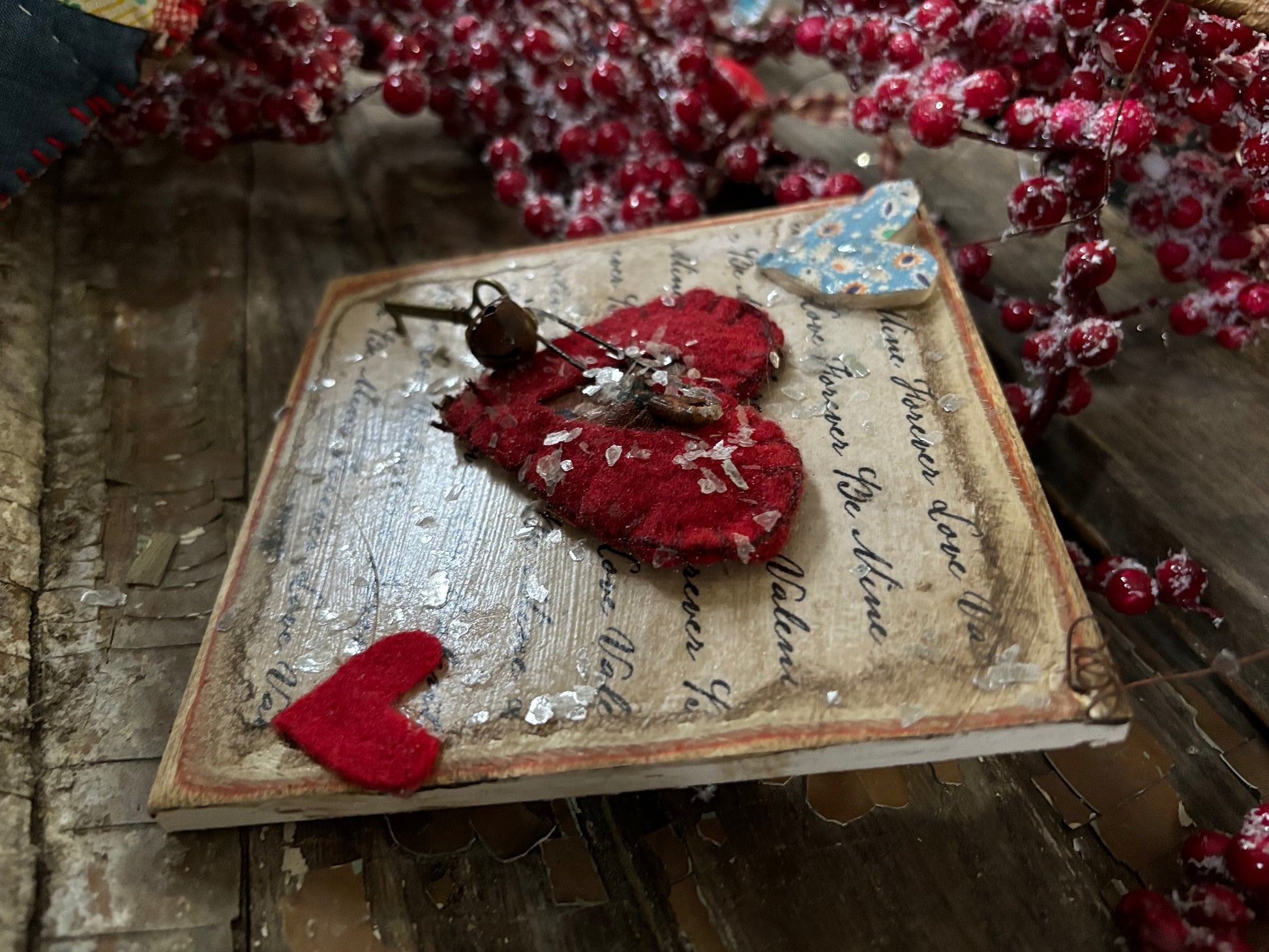 Add a touch of rustic charm to your Valentine's Day decor with this unique, primitive grungy Valentine hanging sign. This farmhouse-inspired piece features sewn hearts that have been taken from an old cutter quilt. They were hand stitched and attached to the sign. There is a cursive letter background that has been decoupaged, sanded, and stained to give that old primitive look. It’s the perfect addition to any farmhouse or primitive style space.