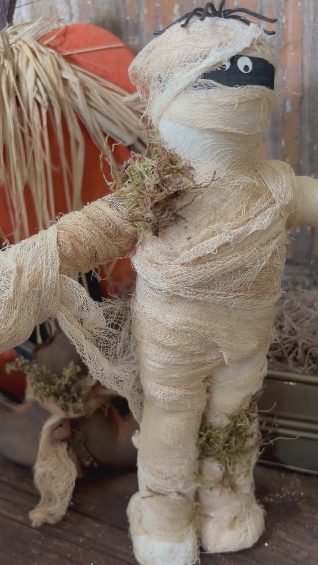 This spooky Halloween mummy is completely handmade using fabric, cheese cloth, and clay. The doll is self standing and features sturdy feet that provide weight. Has a painted face, and is draped in stained cheesecloth to look old and worn. He would make a great shelf sitter, cupboard display, or propped on a Halloween tiered tray.