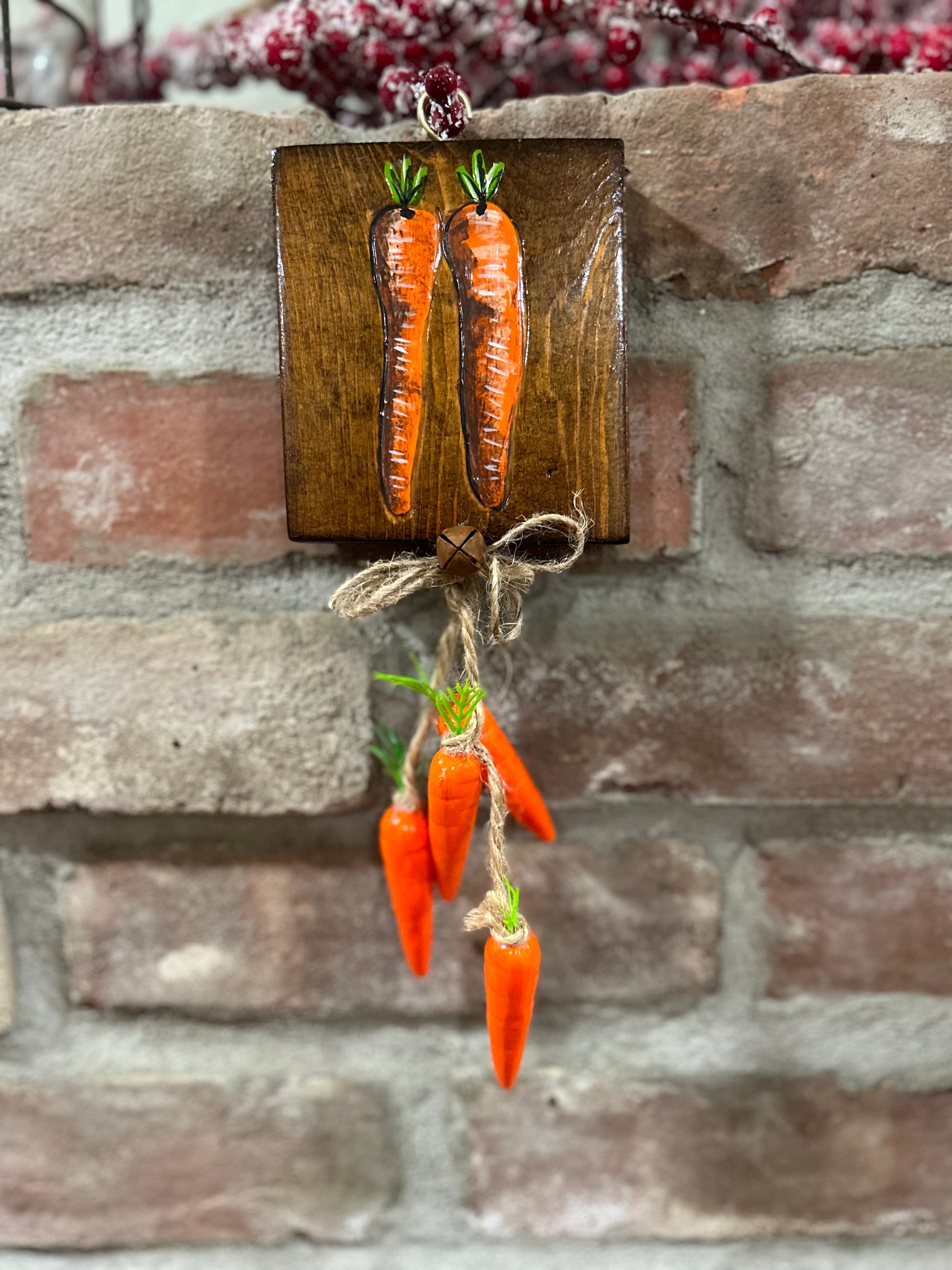 A vintage handmade primitive plaque featuring garden carrots on a glossed wooden square. The plaque is stained in a dark wooden color and has dangling carrots suspended from twine. It’s an adorable piece of spring or Easter decor!