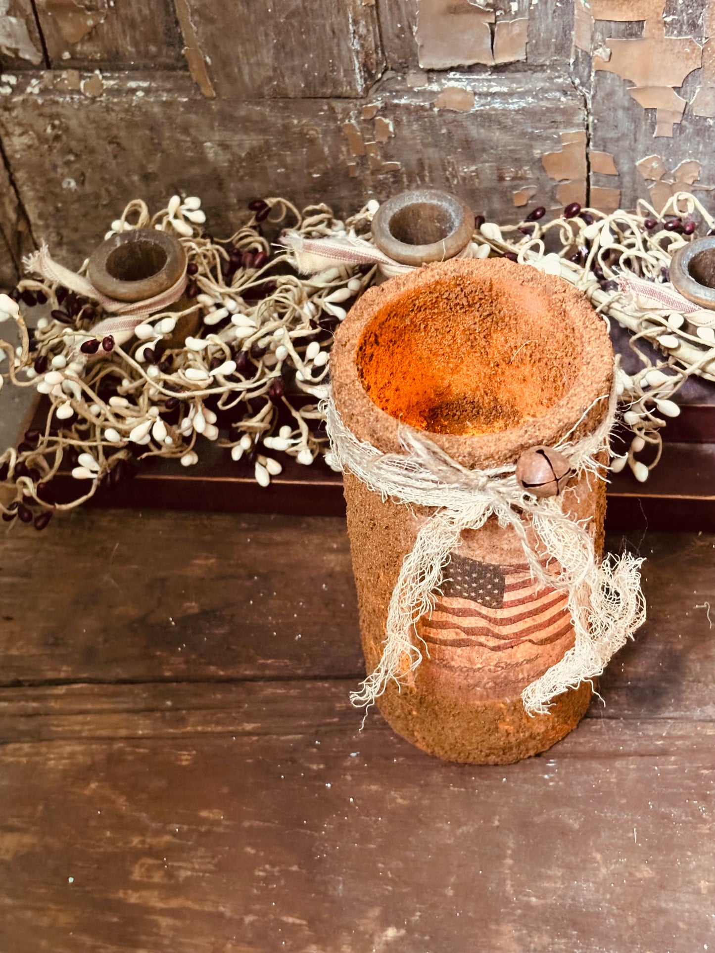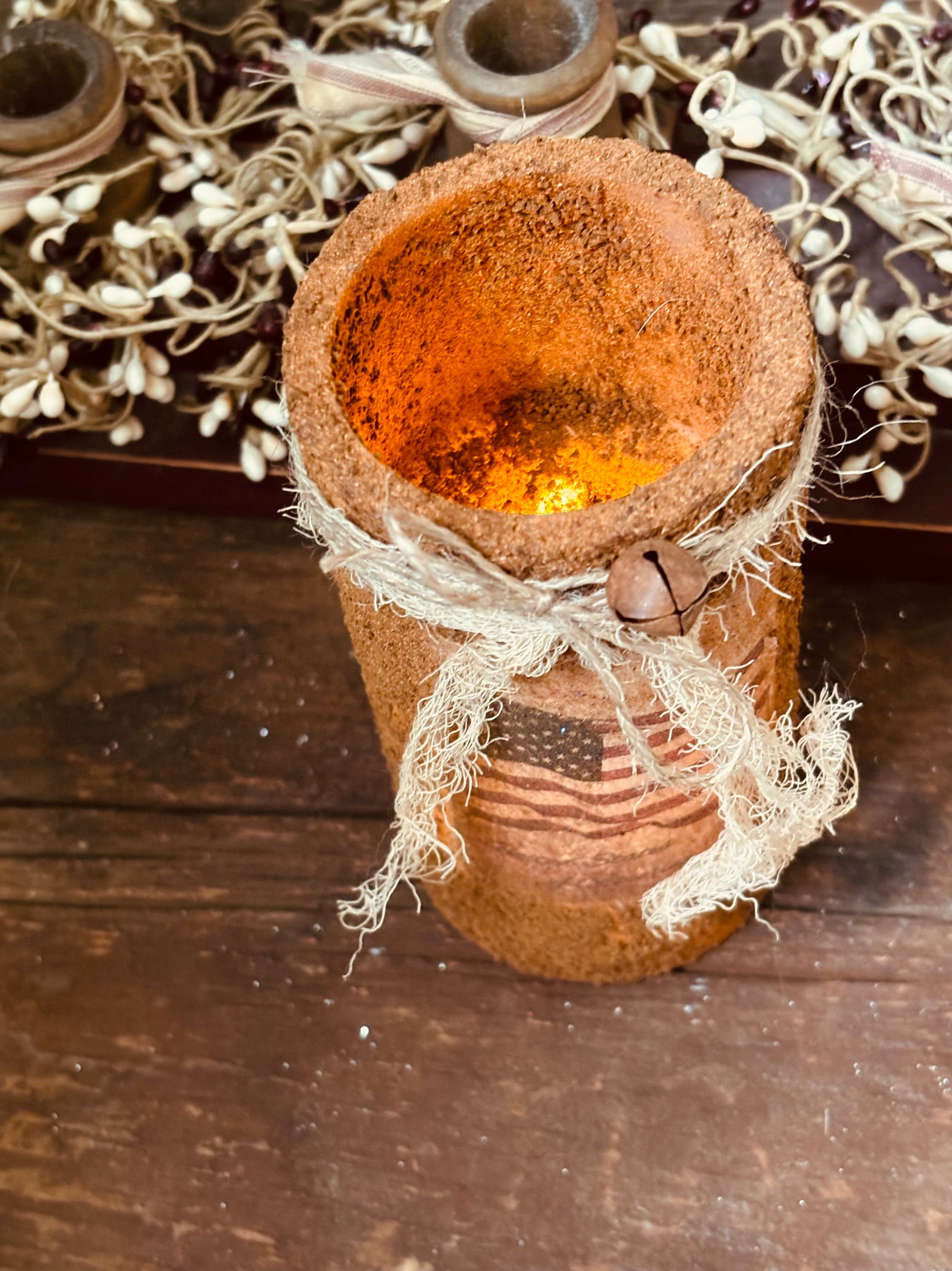 A handmade primitive grubby LED pillar candle in a beautiful Americana/patriotic style. The candle is made using a special spice mixture and sealant, and then given primitive embellishments. the candle has a warm glow, which looks lovely when candle is turned on. I used a high quality, vintage image of the American Flag. it has been printed on grain sack fabric, and carefully adhered to the candle. It takes 3 AAA batteries and has a self timer switch on the bottom. I use only high quality wax pillar candles when I create my grubbies.