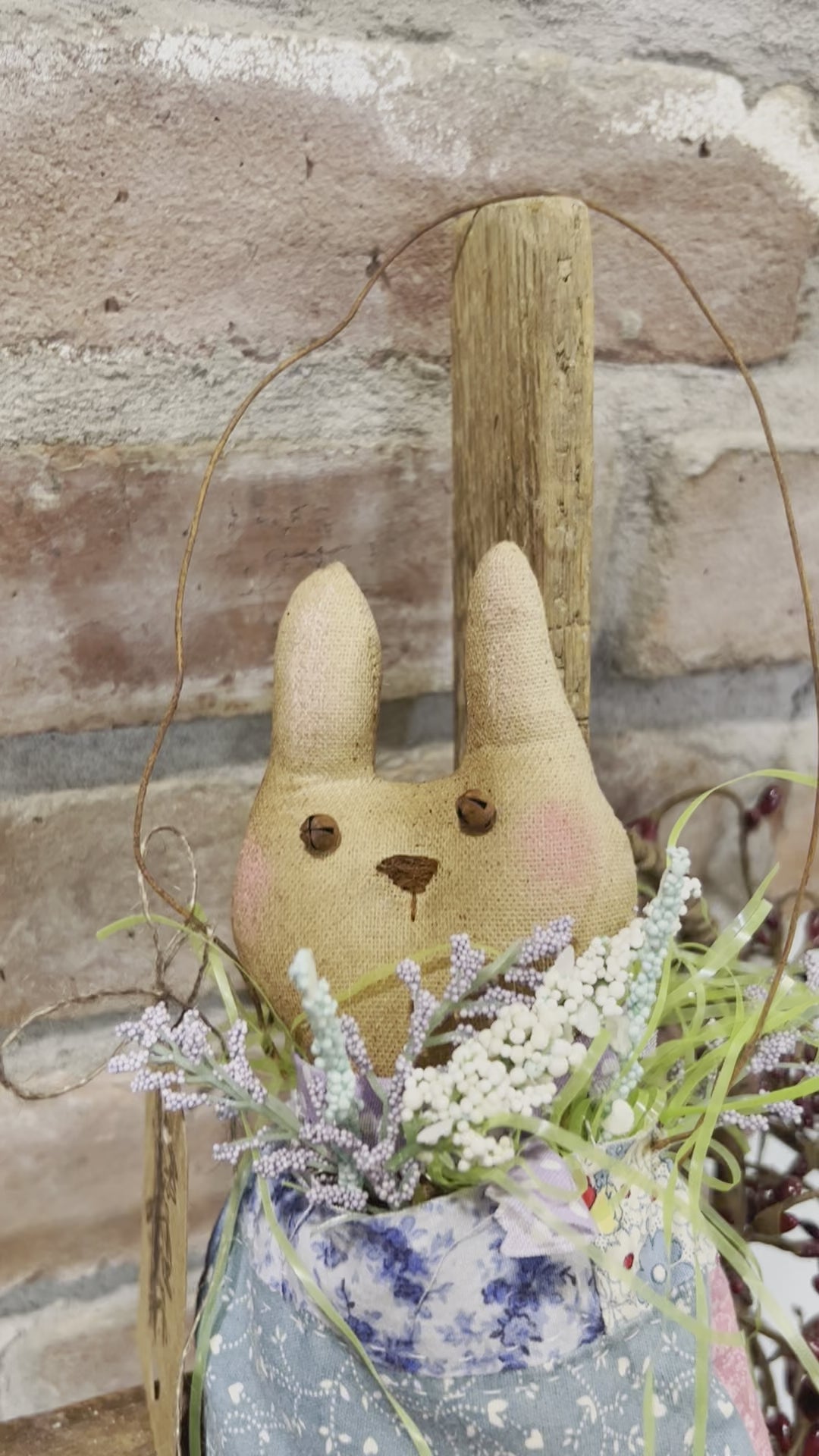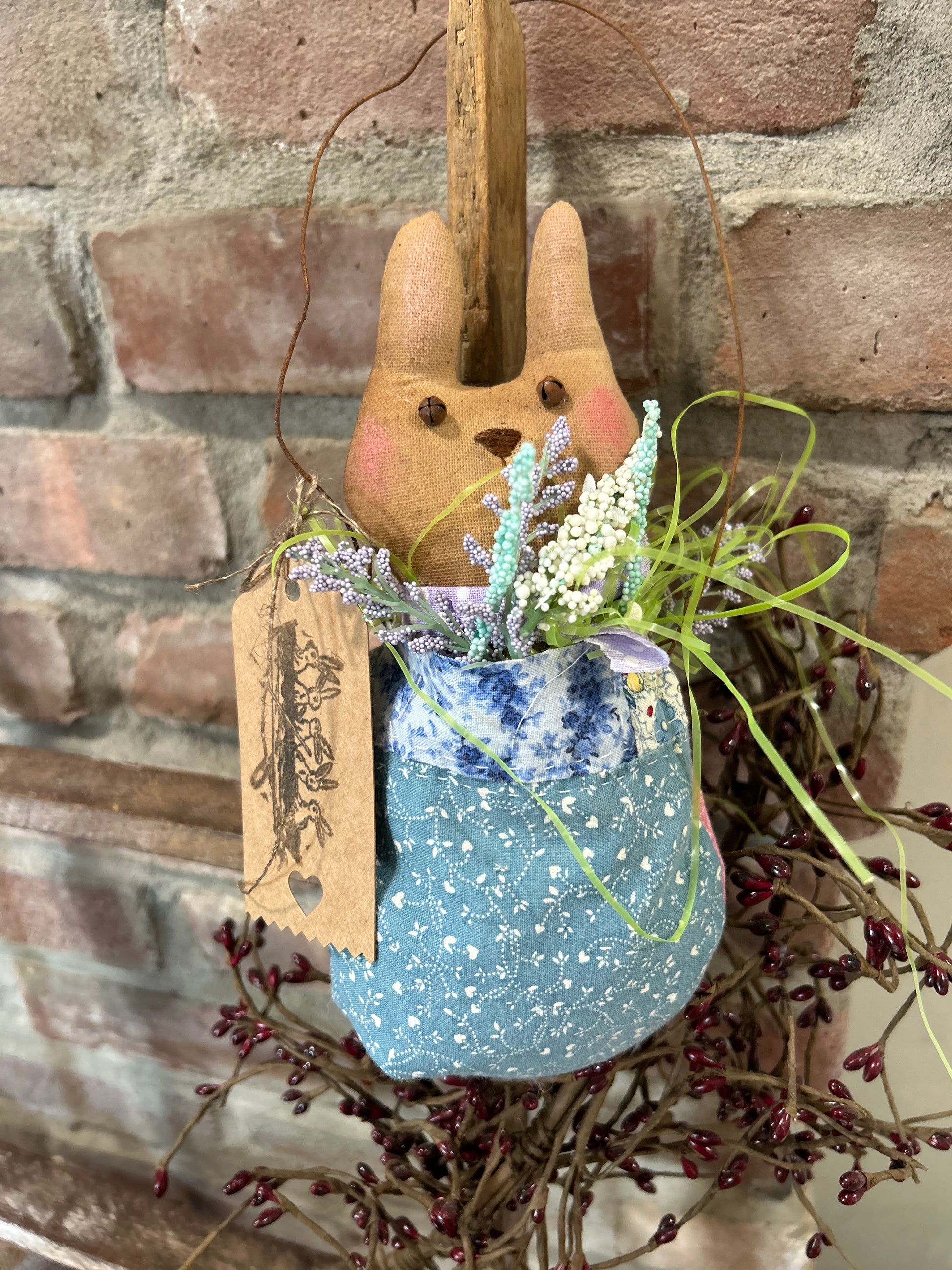 A handmade hanging ornament of a hand sewn Easter bunny inside of a primitive quilted egg. The egg is sewn from vintage quilted blankets, and is stuffed with Easter grass, and spring seasonal greenery. The bunny has a spring scarf and an embroidered face. He is lightly distressed for an aged appearance. He hangs from a rusty wire and can be used on the wall, on an easter tree, or in a cupboard!